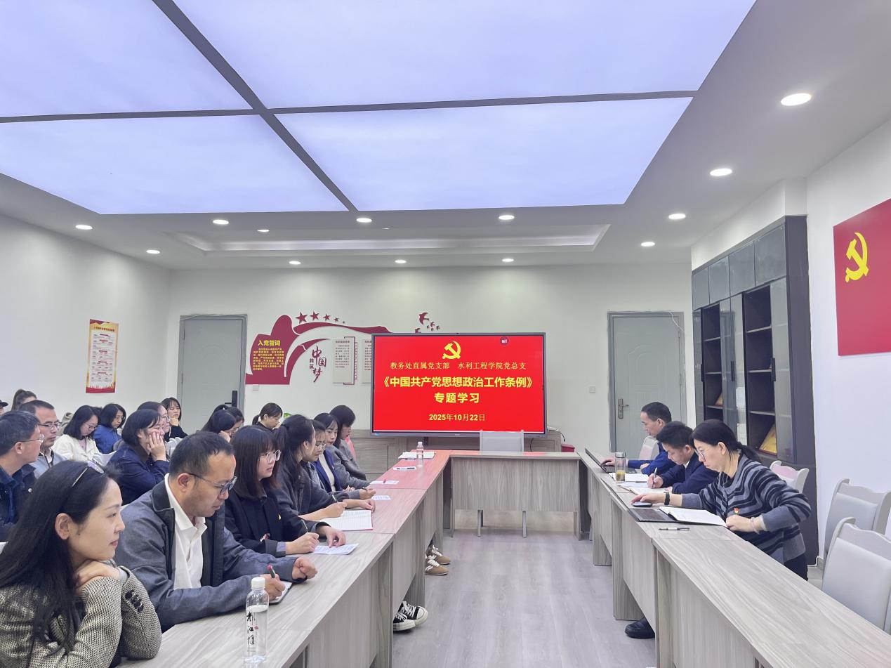 2025年10月22日下午,水利工程学院党总支与教务处直属党支部联合开展主题党日活动,通过专题学习、业务交流和实地参观等形式,推动党建与业务深度融合,凝聚发展共识。活动由水利工程学院党总支书记主持,36名党员代表参加本次活动。