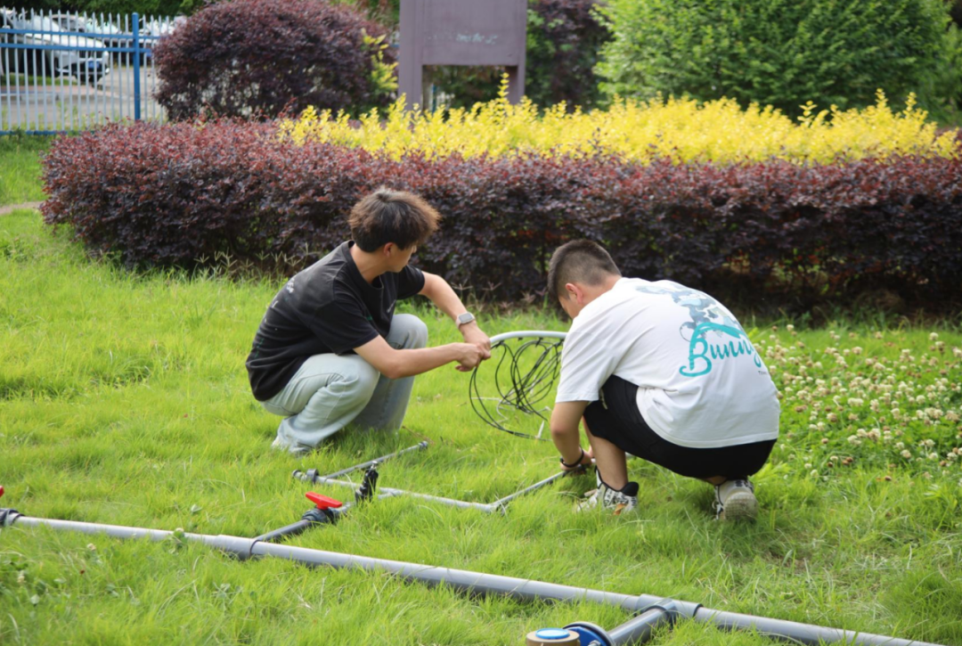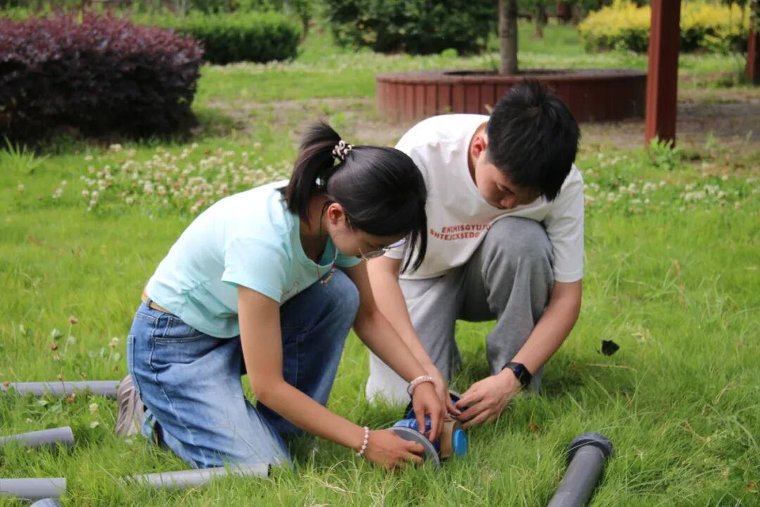青绿的草地上,一个个忙碌的身影映入眼帘,同学们争分夺秒的安装管道,一切都有条不紊的进行着。管道安装两人一组,共同协助组装管道,比赛以参赛者的组装时长、各部分装置的作用讲解熟练程度、组装完成度等进行评分。