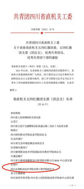 2022年是中国共青团成立100周年。近日,为表扬先进、树立典型,激励各级团组织和广大团员、团干部奋发有为、再创佳绩,共青团四川省直机关工委做出表彰决定。四川水利职业技术学院水利工程学院团总支荣获“省直机关五四红旗团总支”荣誉称号!