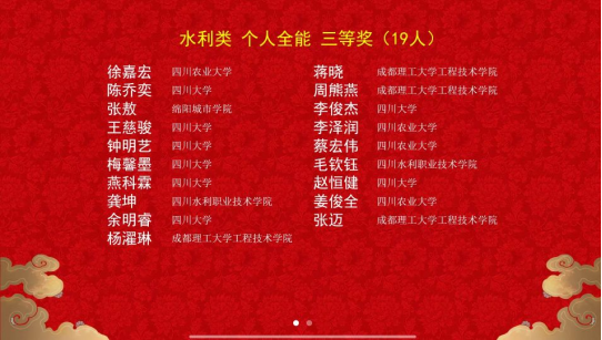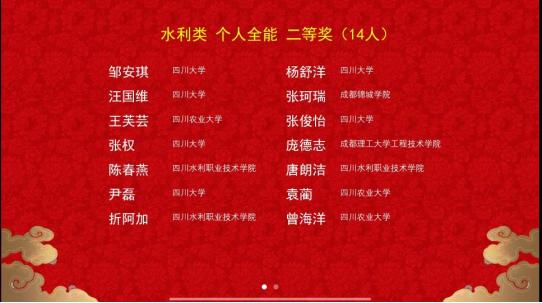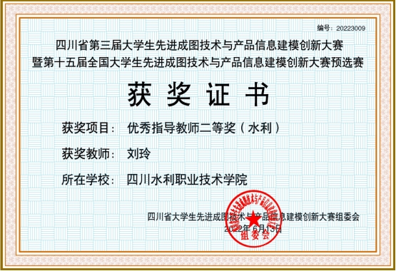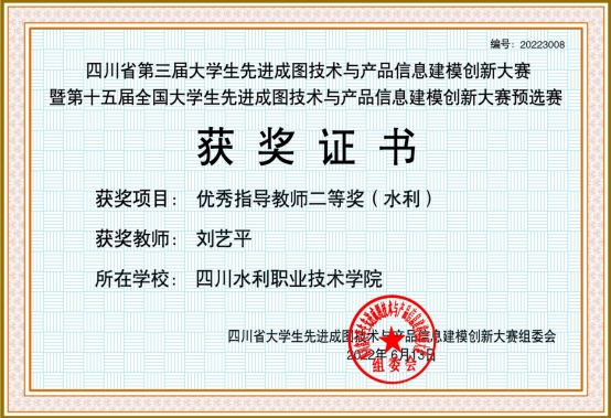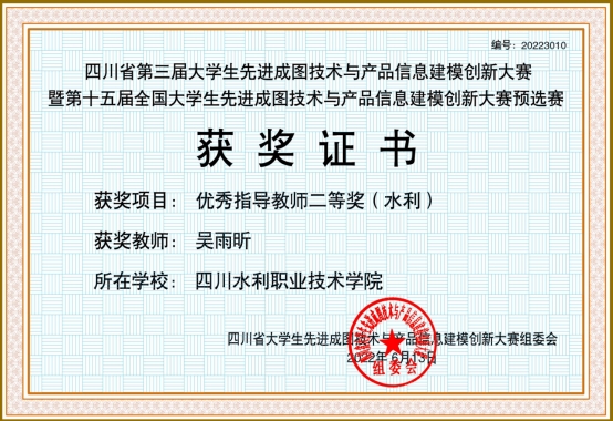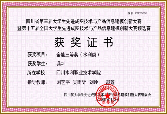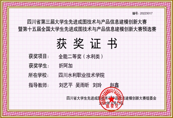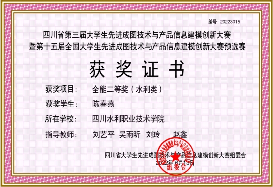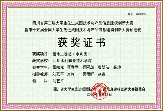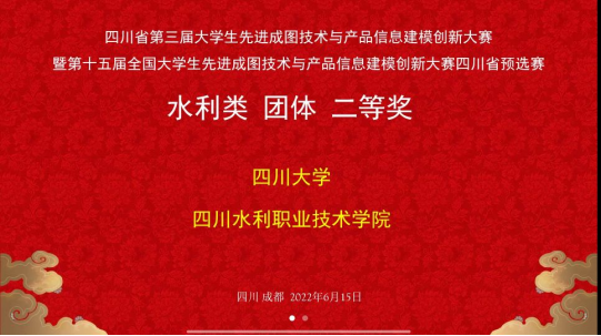 2022年5月27日至29日,四川省第三届大学生先进成图技术与产品信息建模创新大赛暨第十五届全国大学生先进成图技术与产品信息建模创新大赛四川省预选赛在线上顺利举行。大赛由四川省教育厅、全国大学生先进成图技术与产品信息建模创新大赛组委会、中国图学学会产品信息建模专业委员会、中国图学学会制图技术专业委员会主办,西南交通大学承办。此次大赛吸引了来自全省共计27所高校,48支队伍,共计638名同学参赛,涵盖了机械类、建筑类、道桥类和水利类四个类别的团体竞赛和个人全能竞赛。水利工程学院由9名同学组成的代表队参加了此次大赛水利类的竞赛,与四川大学、西南交通大学、四川农业大学等川内高校的选手同台竞技,经过激烈角逐,最终取得团体二等奖,并获得1个个人全能一等奖,3个个人全能二等奖,2个个人全能三等奖,其中:由岳蛟龙、陈春燕、折阿加、唐朗洁、龚坤5位同学组成的团队获得团体二等奖,岳蛟龙同学获得个人全能一等奖,在所有参赛的职业院校中位列第一名,陈春燕、唐朗洁、折阿加3位同学分别获得个人全能二等奖,龚坤、毛钦钰2位同学分别获得个人全能三等奖。刘艺平、赵鑫、刘玲及吴雨昕4位老师获得优秀指导教师二等奖。并获得7个全国决赛参赛席位。
