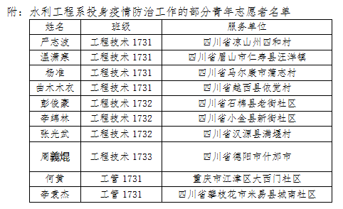 正值新春佳节,本该走亲访友、娱乐欢快地度过,但一场由新型冠状病毒肺炎导致的疫情在此时爆发。短短几天,全国疑似患者、确诊患者人数斗增。这给医务工作者、政务工作者带来了巨大的工作挑战和困难。在此急需之际,水利工程系青年志愿者积极主动投身家乡所在地疫情防治工作,自发到基层社区报到,接受基层社区安排调度。