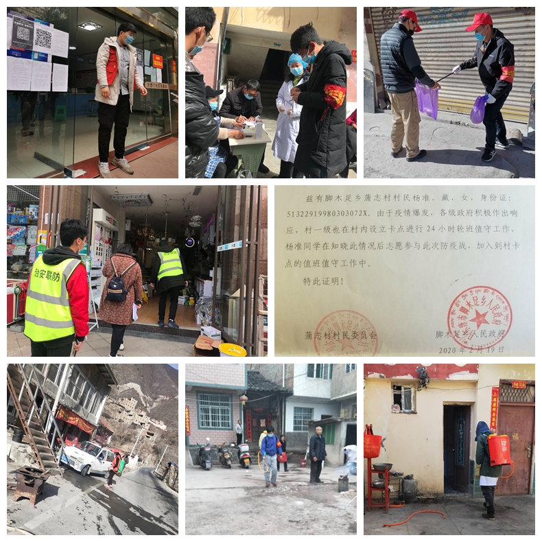工程技术1732班李绵林同学说:“相比在一线工作的医务人员,我们做的并不多。工作内容主要是在社区门口引导人办理常住、外来人口注册登记;维持业务大厅秩序,讲解复工、外出务工、企业复工的流程;为居民讲解新型冠状病毒肺炎的危害,对申请复工的门店进行检查是否配备口罩、消毒液、体温计;对人流量大的场所进行消毒杀菌;下乡入户排查可疑病例等。能力有限,事情虽小,但是我在用我自己的行动、方式表达我对家乡、对祖国的热爱。”