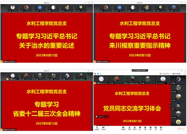 8月12日下午,水利工程学院党总支线上召开党员大会,会议包含专题学习、2023届毕业生就业工作部署、假期工作与安全提醒等三部分内容。会议由水利工程学院党总支副书记吴限主持,院长赵鑫、副院长张磊、张仲驰及全体党员同志参加了本次会议。