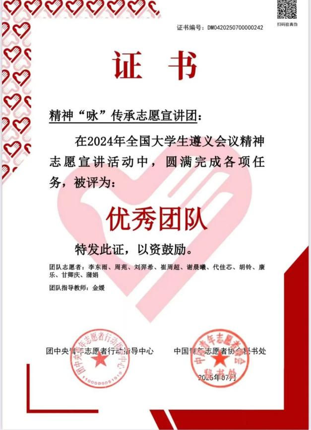 新时代浪潮中,传承与弘扬红色精神是时代赋予青年的使命。为深入学习贯彻党的二十届三中全会精神,落实“强国复兴有我”群众性主题宣传教育活动要求,团中央青年志愿者行动指导中心、中共遵义市委、共青团贵州省委联合开展全国大学生遵义会议精神志愿宣讲团队遴选活动,从全国高校中遴选 1000支团队,最终嘉许100支优秀团队。近日,评选结果重磅揭晓, 我院精神“咏”传承志愿宣讲团成功脱颖而出,一举荣获“优秀团队”与“优秀宣讲视频”两项全国优秀!